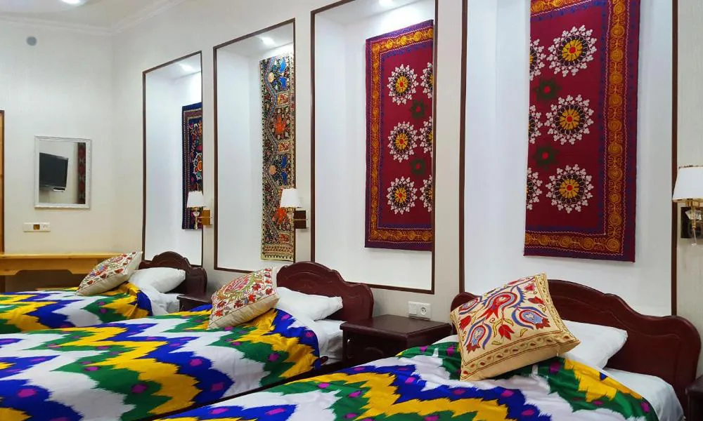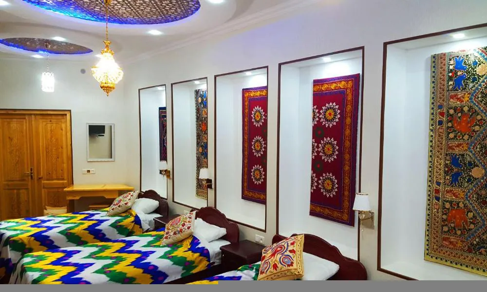 Jahongir guest house offers a family room that can accommodate up to four people. Our family room overlooks the courtyard, and is decorated in traditional way with Suzanies and with ceramic artworks. Our family room has ensuite private bathroom with glass shower room. This room has an air conditioner and has a flat-screen TV with international TV channels and a fridge.