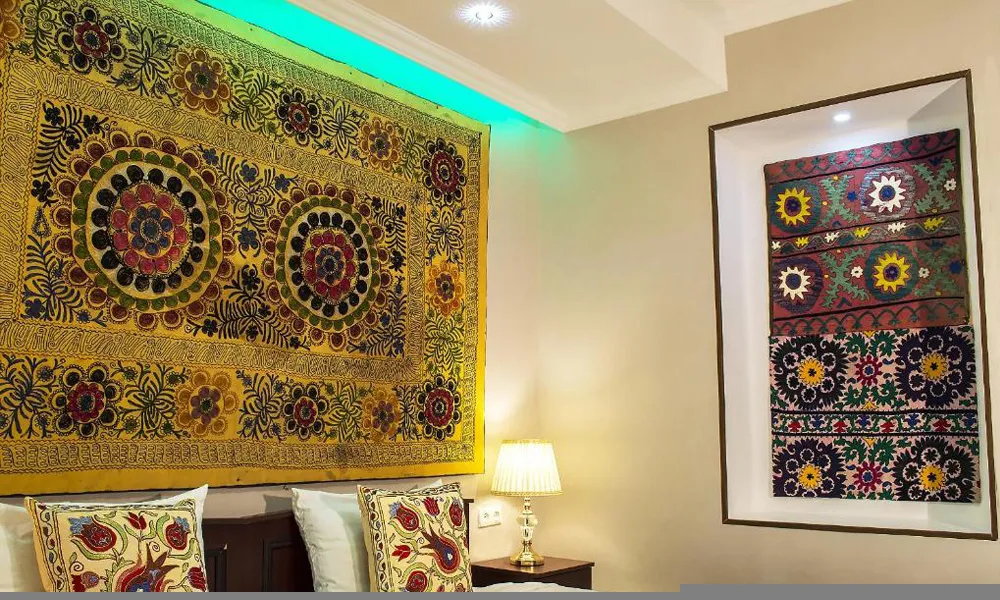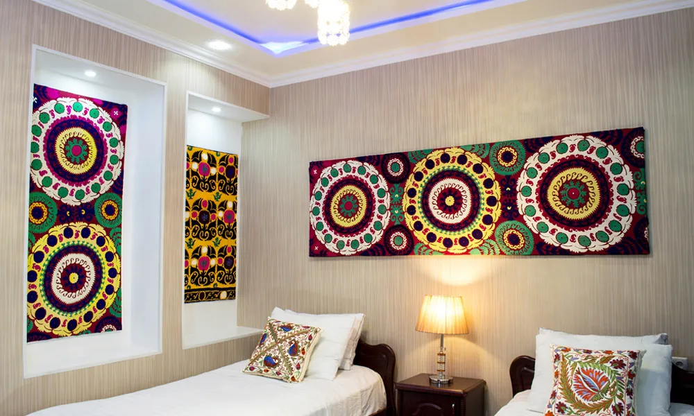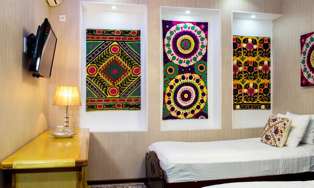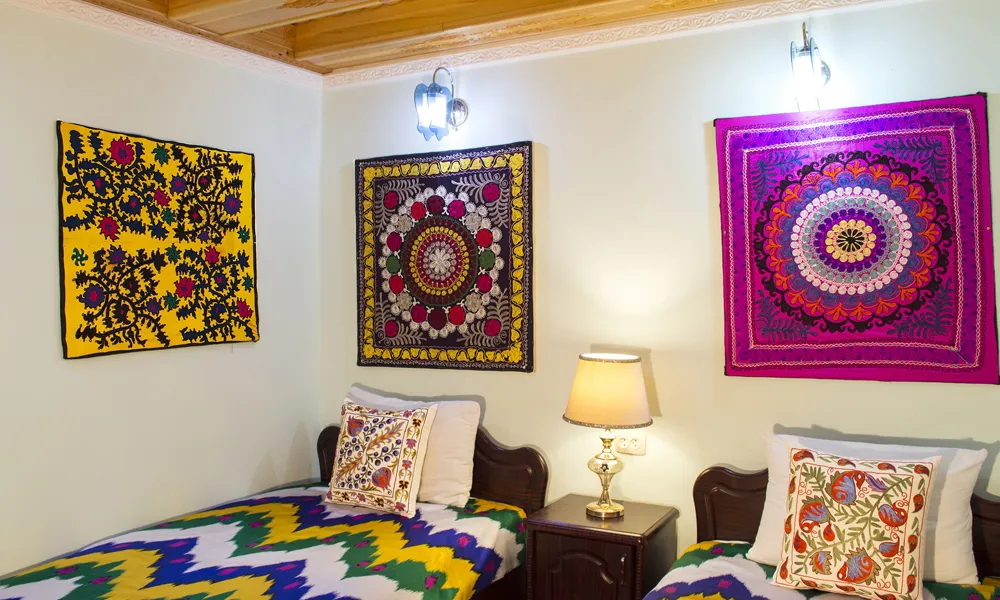 Jahongir B&B twin rooms can accommodate up to two people in adjacent twin beds (90cm wide). Our twin rooms overlook the courtyard, most of them is decorated in traditional way with Suzanne and with ceramic plats. All twin rooms have a private bathroom. Each twin room is air conditioned and has a flat-screen TV with international TV channels.